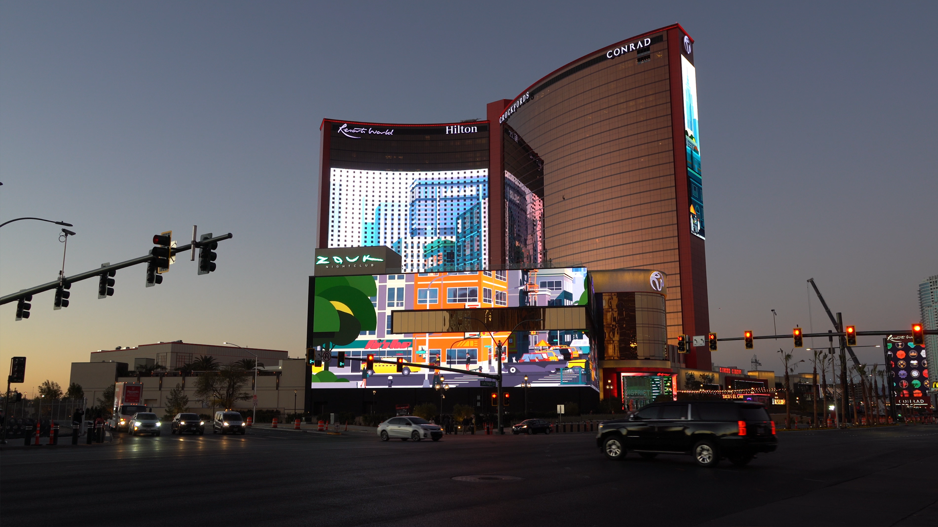 In preparation for the grand launch of ResortWorld: Las Vegas, Digital Kitchen/SidLee was commissioned to create large-scale animation pieces for several unique display formats. These included a 10k screen wrap on a four-story building, a 36-story building façade, and a spherical screen. The animation, titled *Wanderlust*, was inspired by the global legacy of Genting's resorts and aimed to take viewers on an illustrative journey around the world.